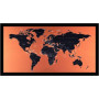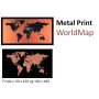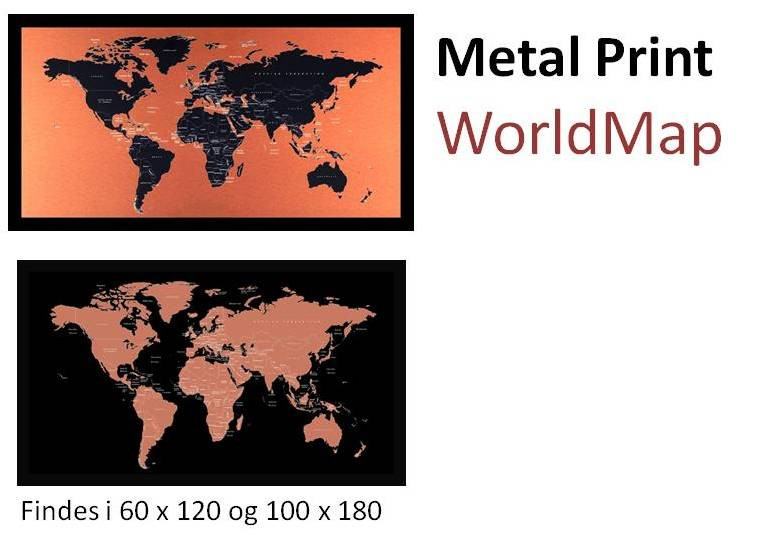 Flot metal print • Verdenskortet føres i 2 størrelser • B: 120 x H: 60 cm • B: 180 x H: 100 cm • Billede fås i flere farvekombinationer: • Sort-alu • Alu-sort • Sort-messing • Messing-sort • Sort-kobber • Kobber-sort