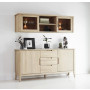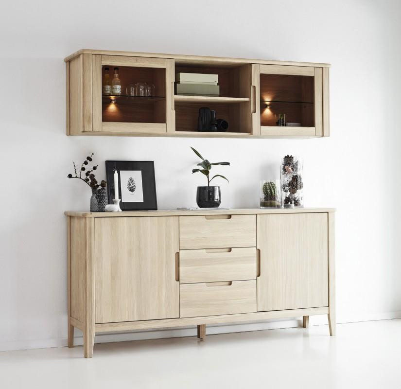 Skænk i massiv hvidolieret egetræ. med 2 låger med 1 hylde taske hver og 3 rummelige skuffer. Denne serie er lavet med indfræset greb som giver serien og meget eksklusivt look. Leveres samlet.Der kan tilkøbes Hængevitrine der passer i design Skænk Mål: B180 x D87 x H45 cm.