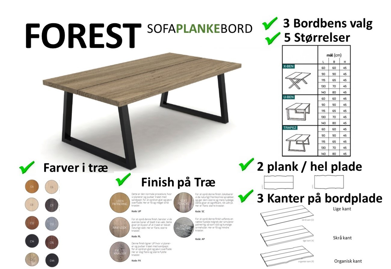 Med Forest massiv sofabord kan du designe dit helt eget sofabord med planker i mange størrelser, hvor du kan vælge mellem en eller to planker på sofabordet samt flere forskellige stel. Kan fås i ask eller eg. Afstandsstykkerne imellem plankerne er samme materiale og finish som du vælger på benene.