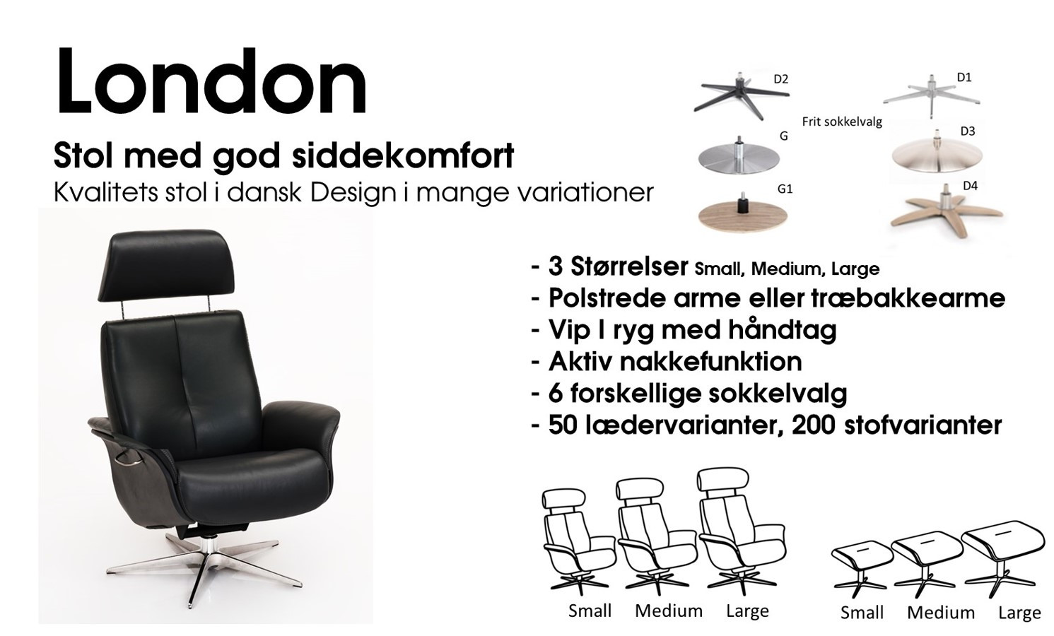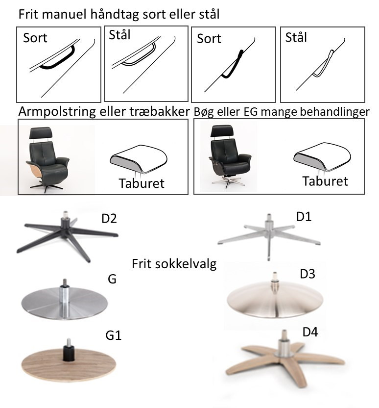Stilfuld stol med god polstring der støtter for de fleste, Findes i 3 størrelser Small, Medium, Large. Findes i læder eller stof og man kan vælge træ på armene eller overpolstring, Der er 6 stk Sokkelvalg og der er designet en taburet til stolen ( tilkøb) - Der er aktiv nakkefunktion med både nakkeløft og nakke vip samt der er aktiv vip i ryg med let håndtag på siden af stolen. Finde prisen ved at vælge stof eller læder - Prisen er på medium størrelse