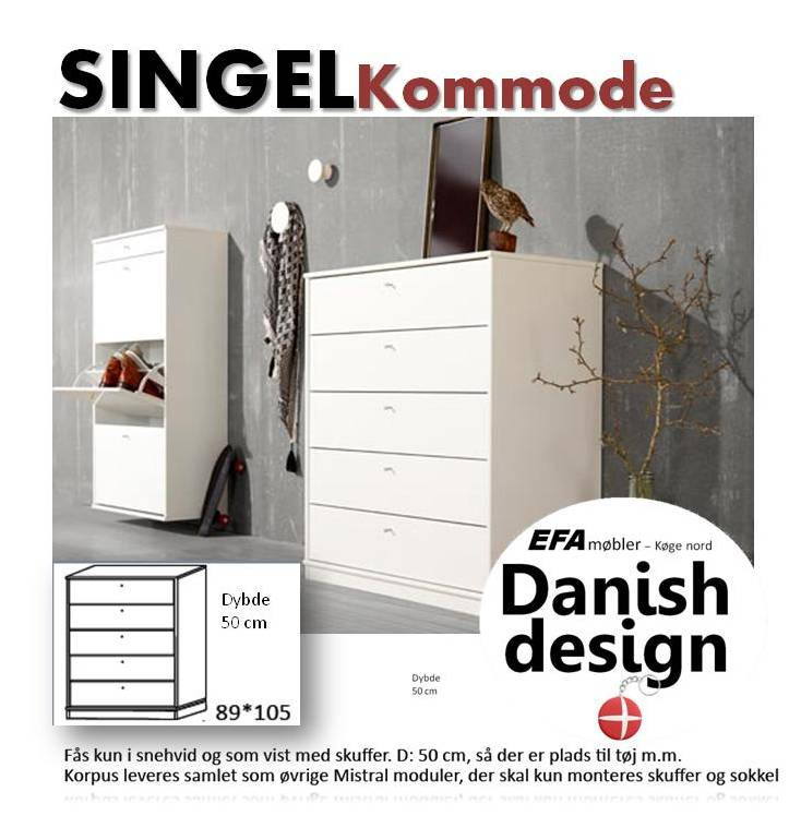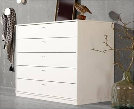 Høj kommode med 5 skuffer der holder til dagligt brug - Korpus leveres samlet - der skal kun monteres skuffer