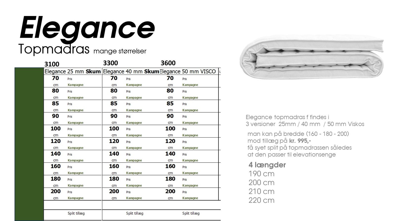 Findes i 3 udgaver A . md 25 mm skum B : ned 40 mm Skum med 50 mm Viskos, Findes i mange størrelser i 4 længder 190/200/210/220