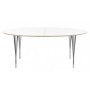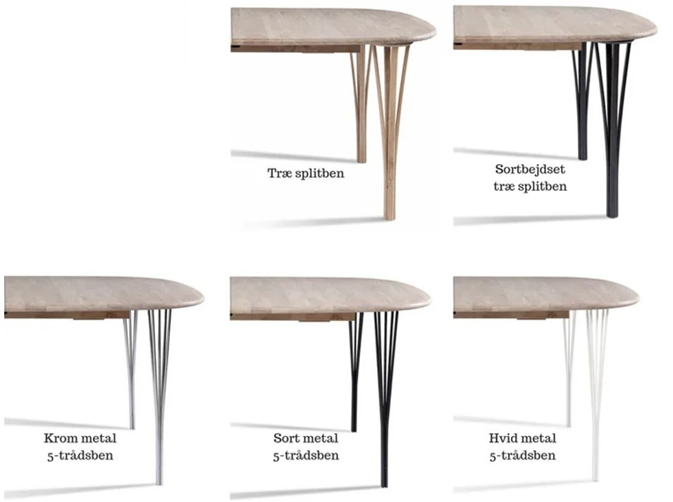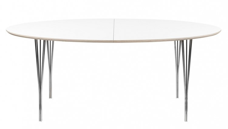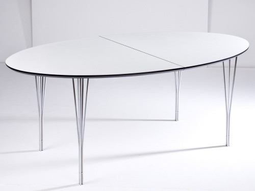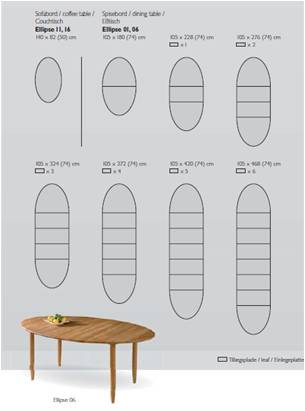 Flot ellipseformet bord fra Haslev møbelfabrik med Laminatplade, Udtræk til 2 plader og 5-trådsben. Laminatpladen kommer som standard med rå birkekrydsfinerkant, men kan også fås med sortbejdset eller hvidmalet kant. Til bordet kan tilkøbes tillægsplader til kr 995,- stk. samt ekstra udtræk helt op til 6 plader med et støtteben på midten kr. 1495,- Mål 180 x 105