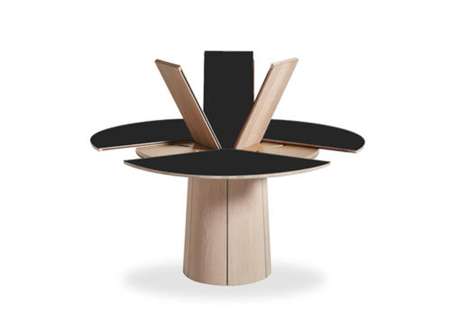 Under bordpladen findes en drejeskive, hvilket får bordpladen til at dele sig i tre, hvor tillægspladerne ligger. De er nemme at folde ud - blot med et let tryk og de popper op. Bordet måler Ø123 cm og kan med tillægspladerne blive helt op til Ø149 cm, så der er god plads til at rumme helt op til 9 personer.